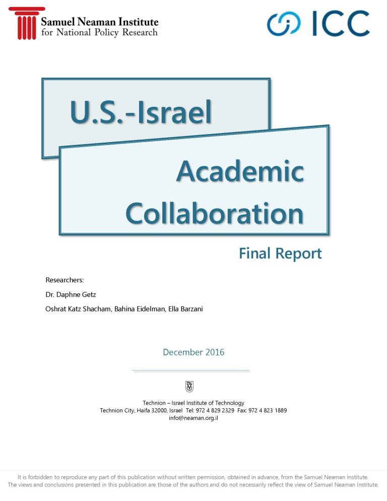 During 2015, the Samuel Neaman Institute submitted a report to ICC describing trends in the development of academic relations between Israel and the U.S. over the past decade, as reflected in the changes that occurred in number of the joint publications by American and Israeli researchers. Among the topics examined are quantitative trends in joint research outputs, leading areas of joint research outputs, leading institutions in joint research outputs, and more. Special emphasis was placed on the fields of social sciences and humanities.