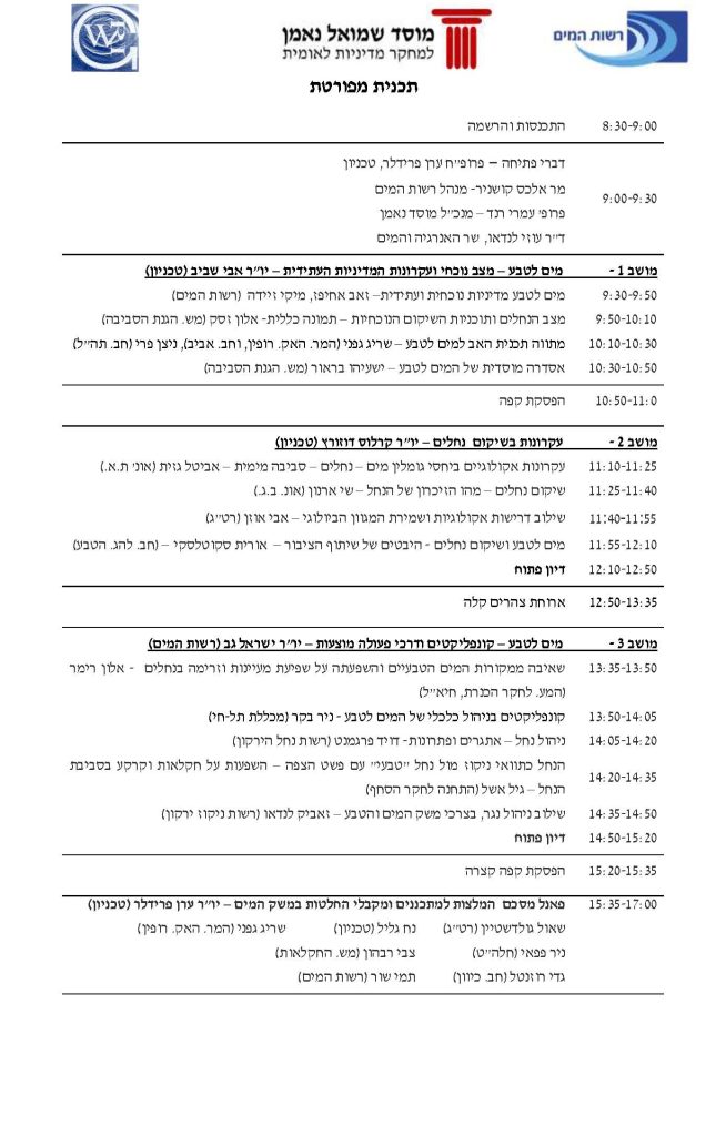 • פאנל מסכם  המלצות למתכננים ומקבלי החלטות במשק המים – מנחה ערן פרידלר (טכניון) אביטל גזית (אונ. ת.א.), שריג גפני (המרכ. האקד. רופין), אורית סקוטלסקי (חלה"ט), ניסים קשת (רט"ג), צבי רבהון (מש. החקלאות לשעבר), גדי רוזנטל (כיוון בע"מ), תמי שור (רשות המים)