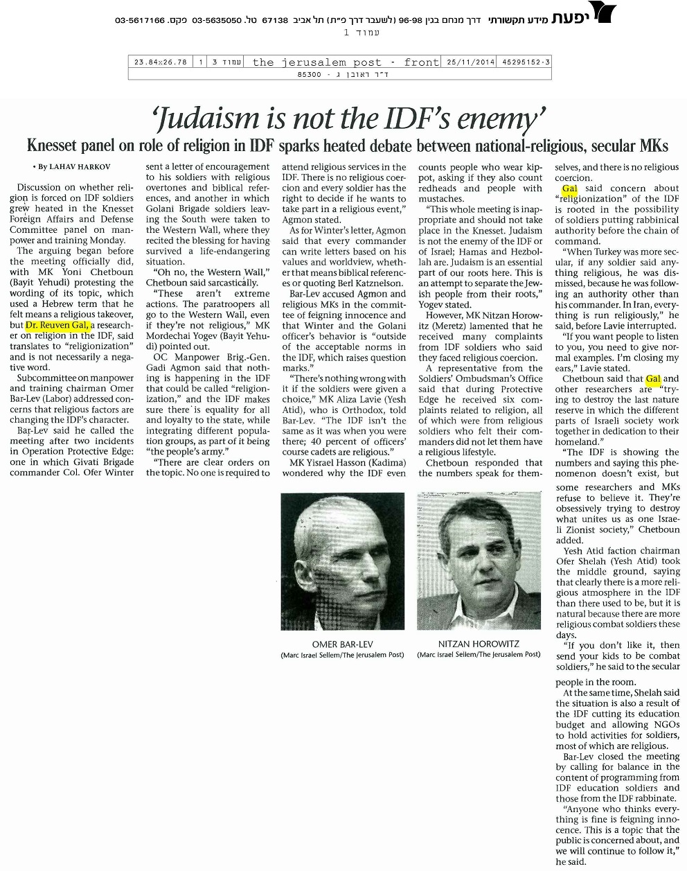 ד"ר ראובן גל שימש כפסיכולוג ראשי של חיל הים הישראלי ולאחר מכן כפסיכולוג ראשי בצה"ל ומפקדו הראשון של מערך מדעי ההתנהגות (ממד"ה) בצה"ל.